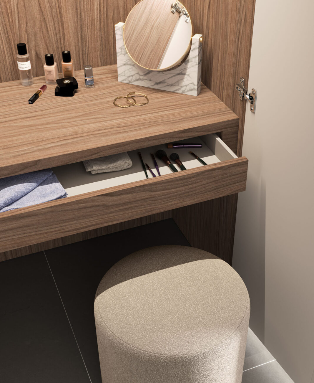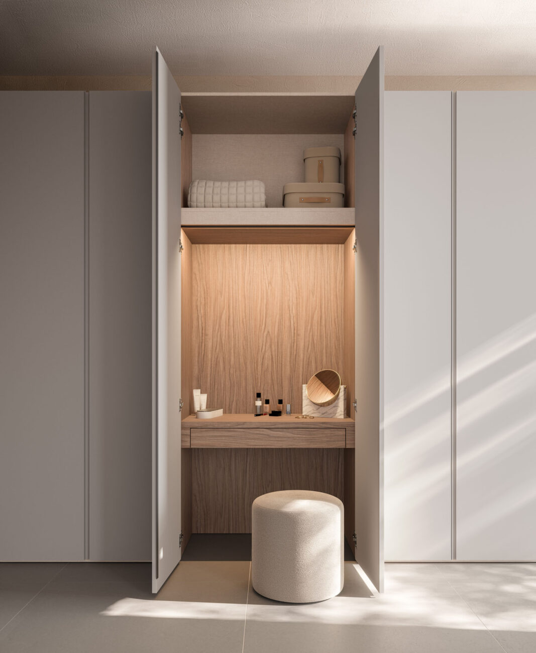Armadio battente Tratto in Velluto e modulo ponte Vanity in Velluto e Noce, maniglia dedicata in tinta.