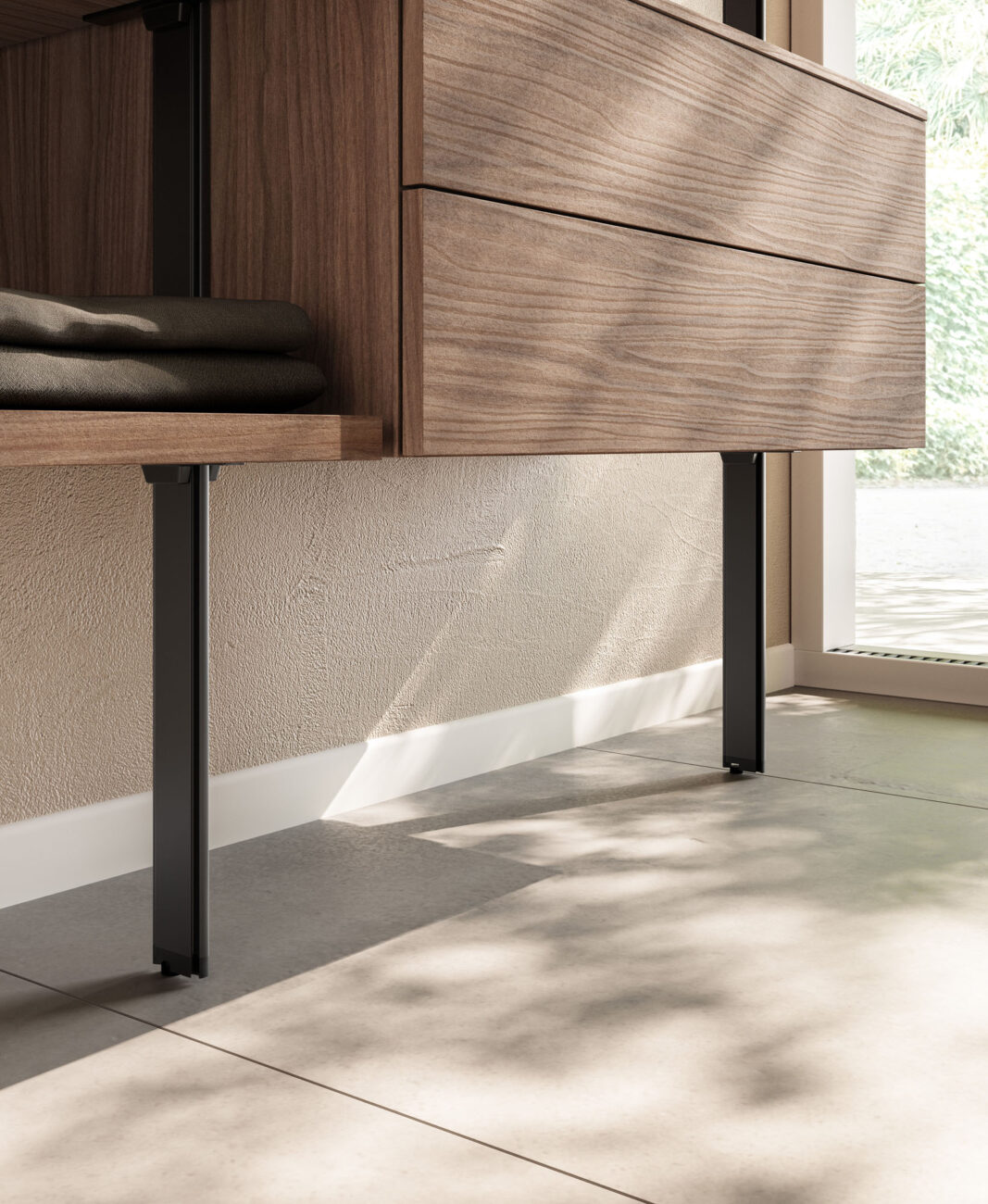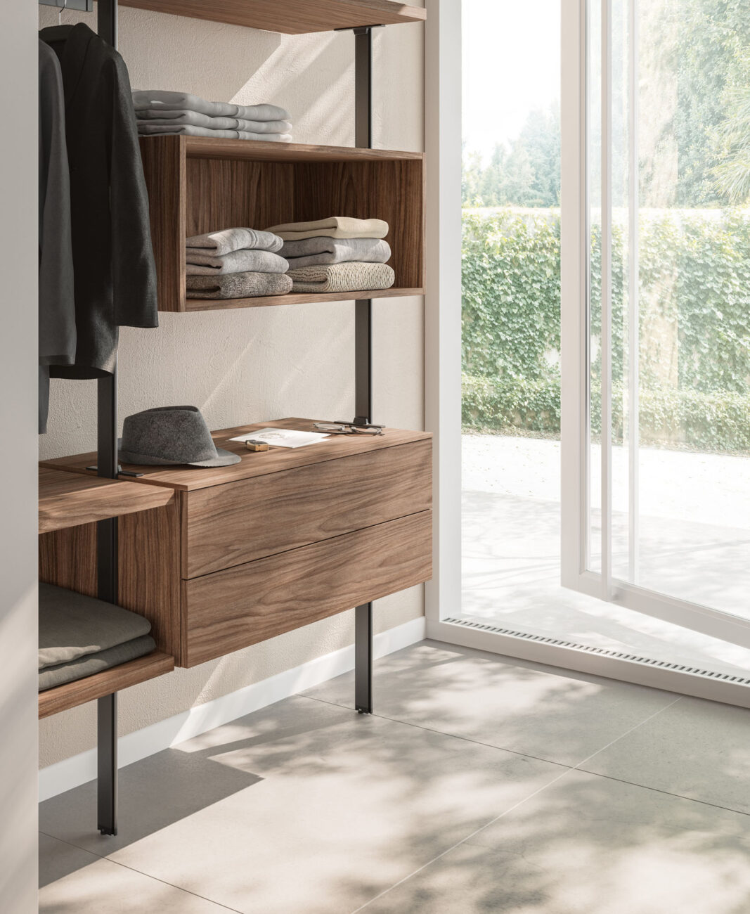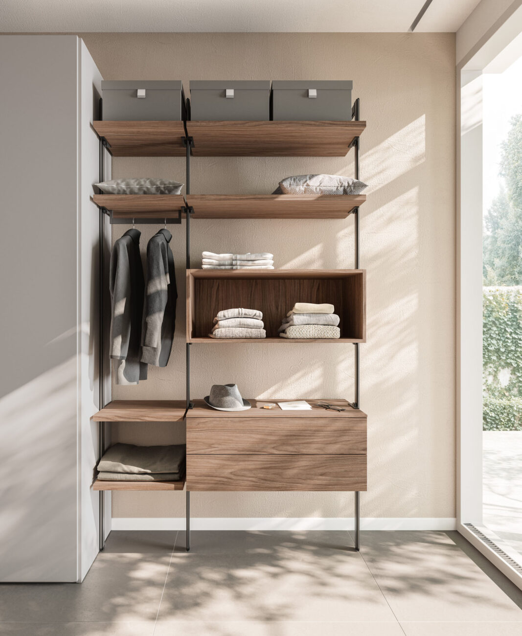 Cabina Pole in Noce, attrezzata con ripiani, tubo, pensile a giorno e cassettiera.