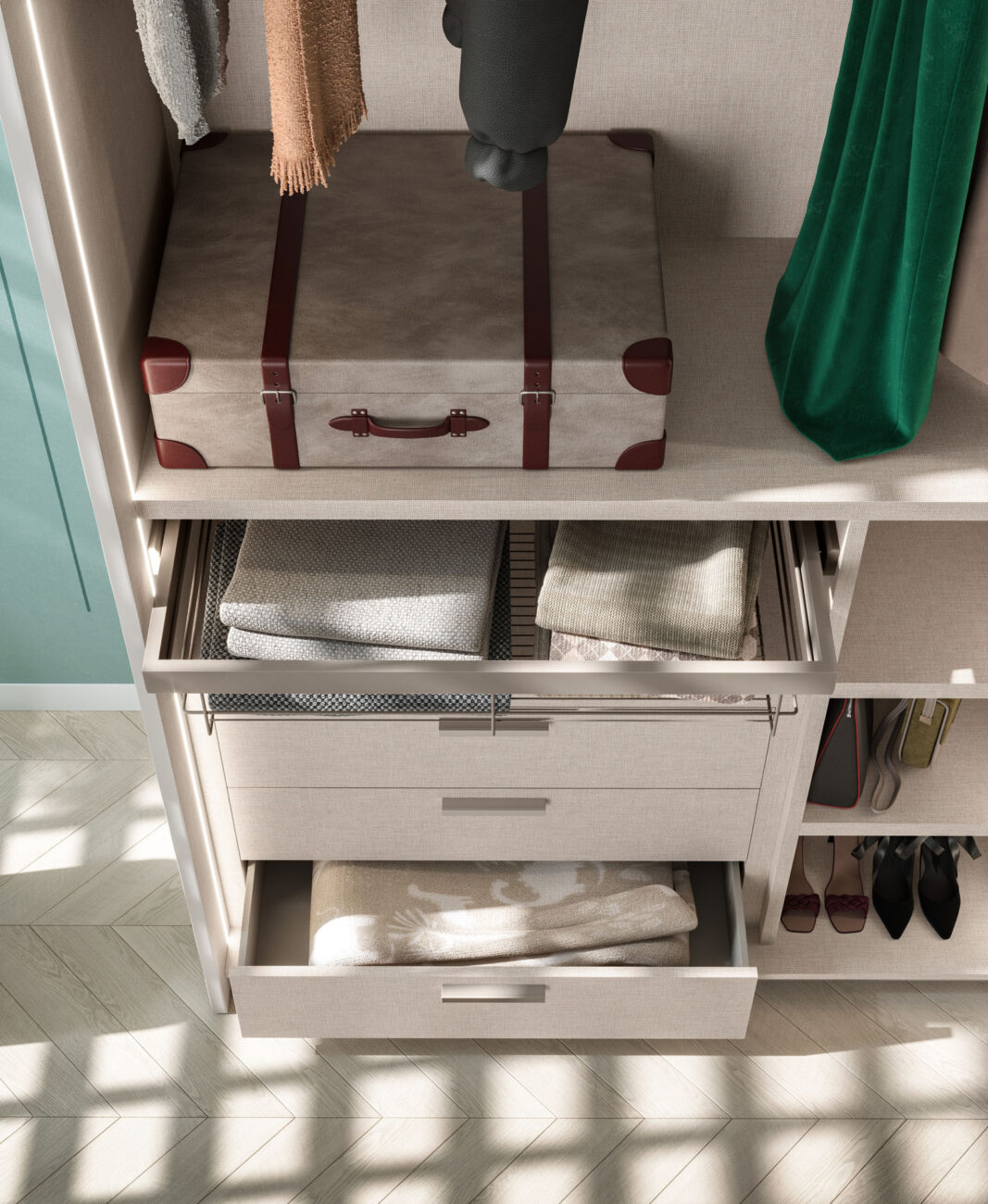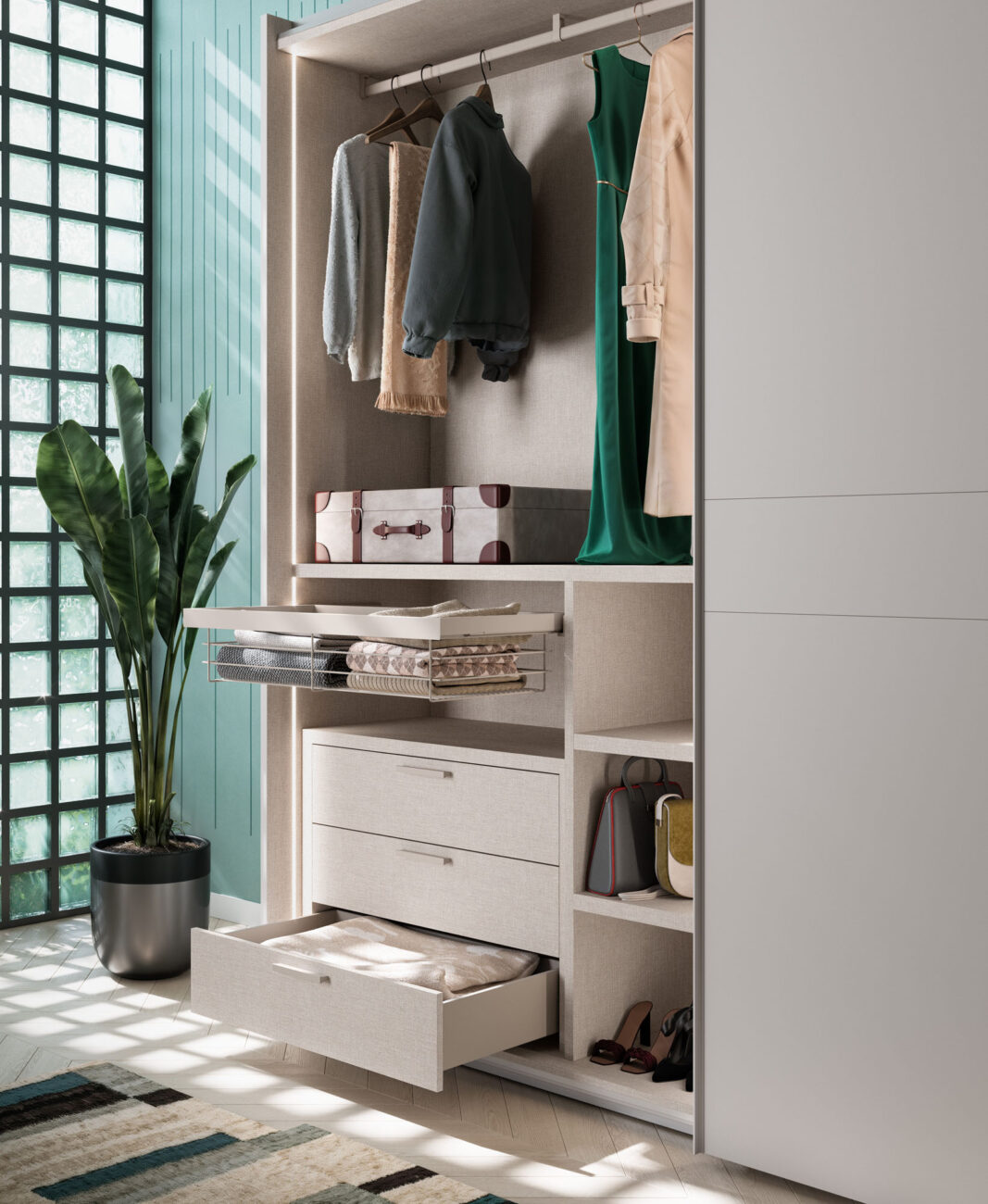 Colonna armadio attrezzata con tubo, ripiano, cestello estraibile, cassettiera, divisorio verticale e luci LED verticali.