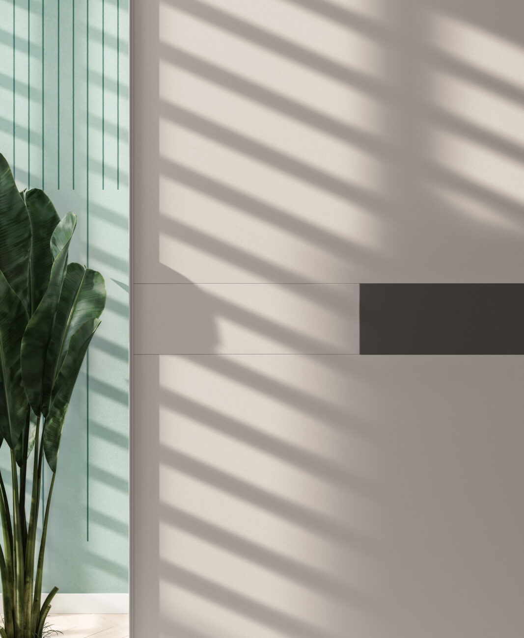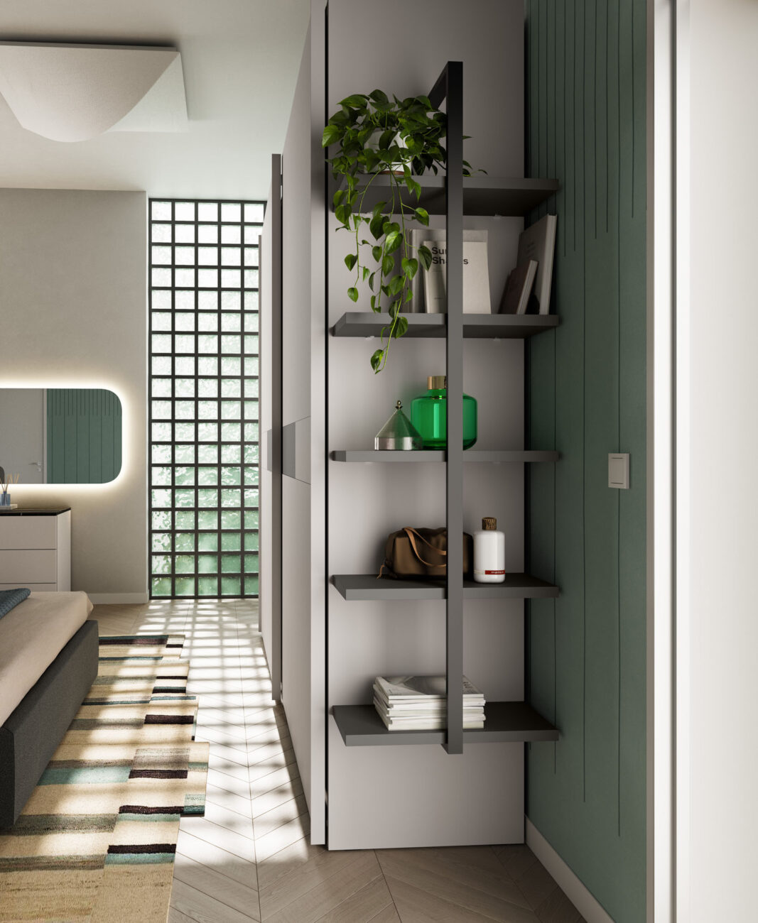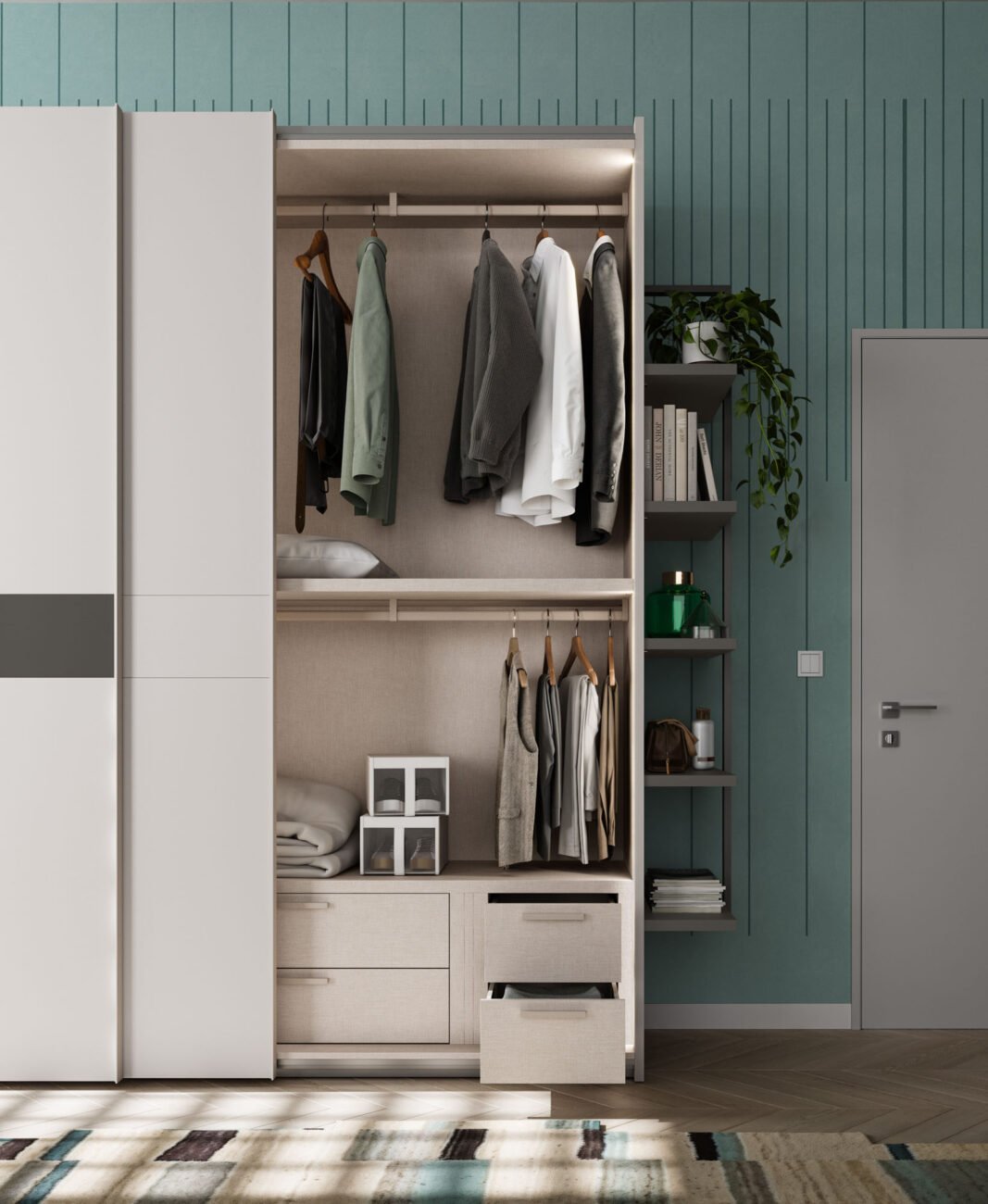 Armadio scorrevole Belt in Velluto e Lavagna, maniglia dedicata in tinta, attrezzato con tubi, ripiano, cassettiera e luci LED verticali. Ambrogio in Lavagna.