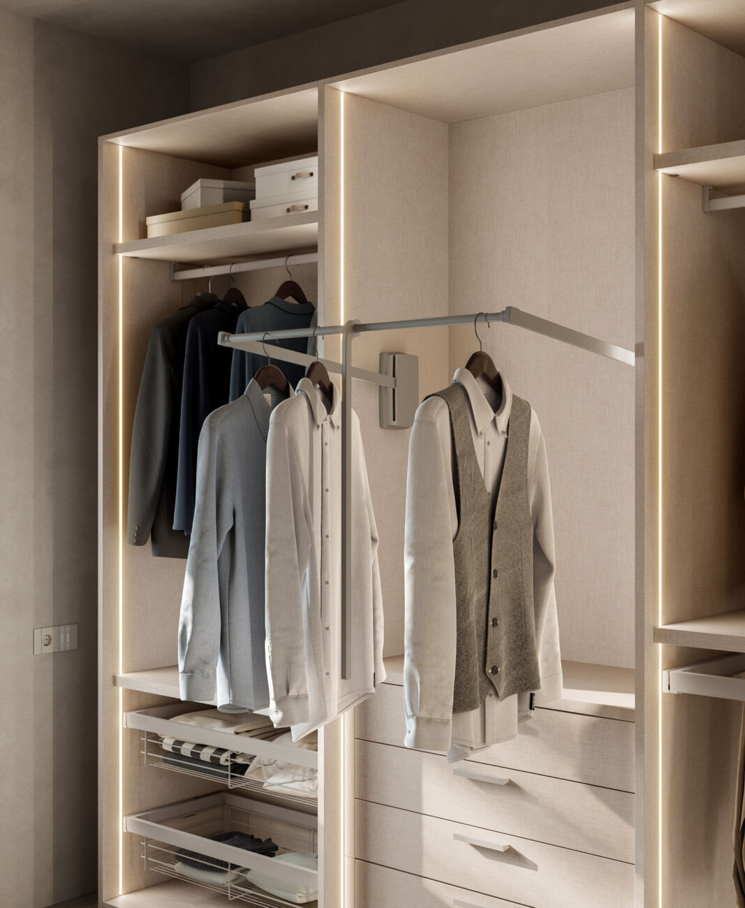 Attrezzatura interna composta da cestelli estraibili, cassettiera, Servetto appendiabiti e luci LED verticali.