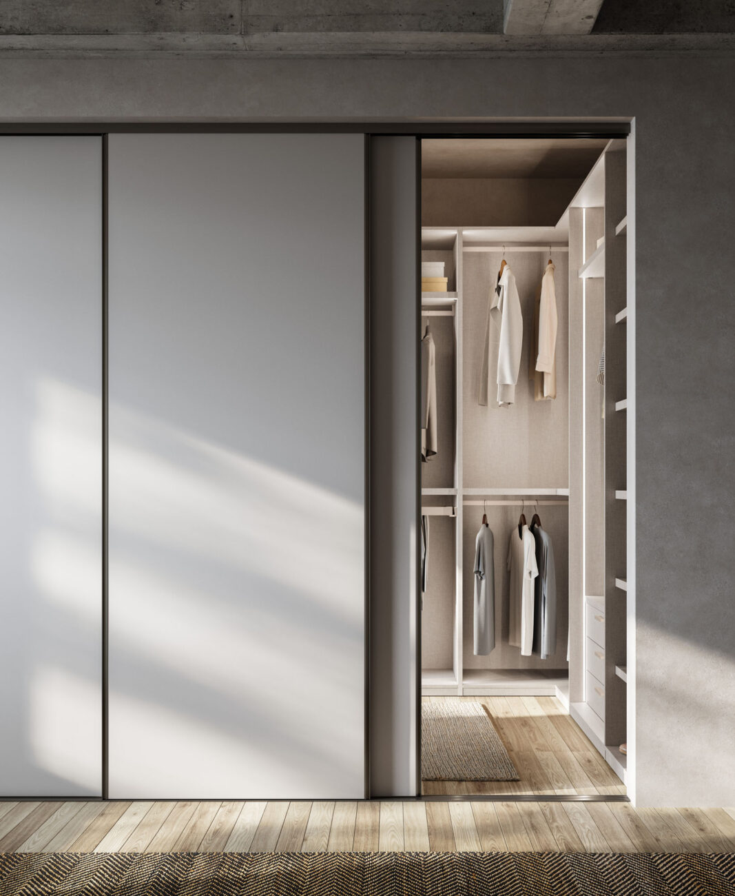 Portale Basic con ante scorrevoli in Velluto e armadio senza ante in Cotone.