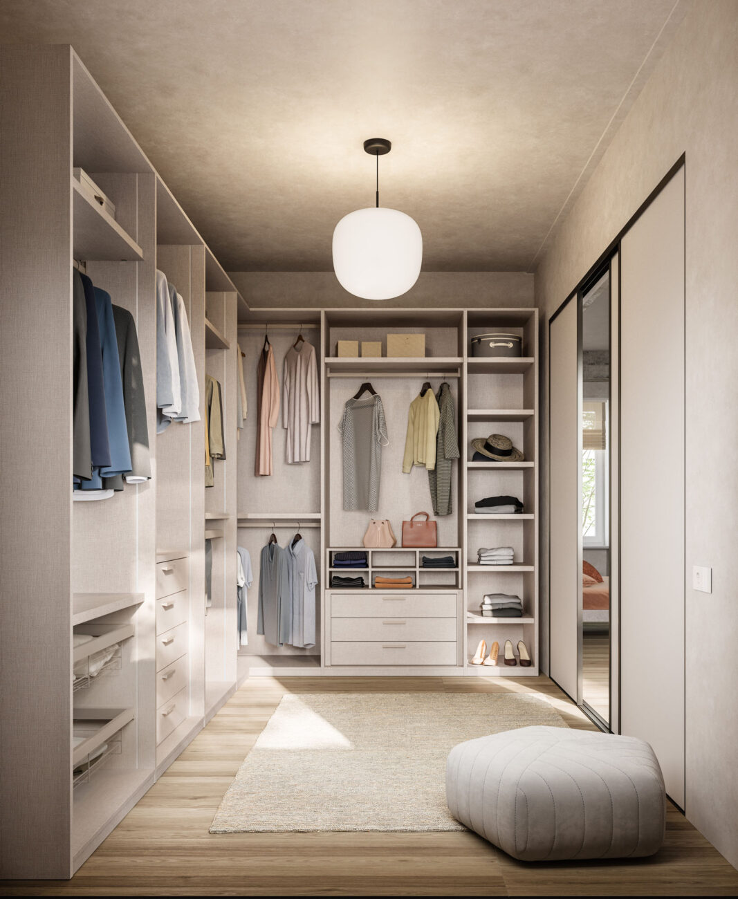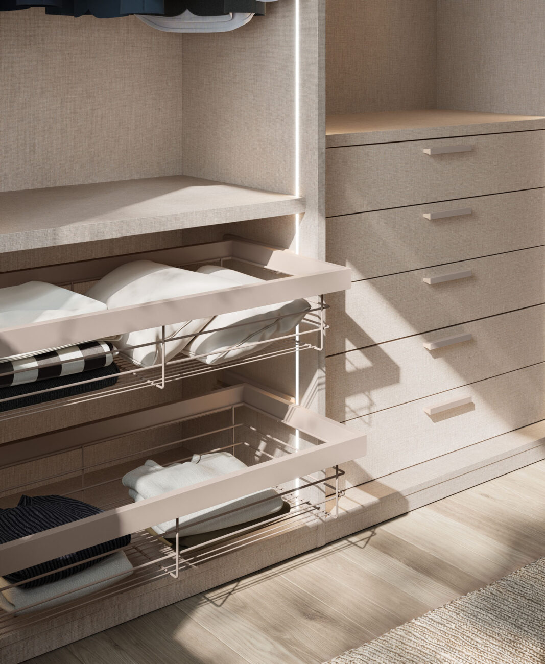 Armadio senza ante attrezzato con tubi, ripiani, cestelli estraibili, portapantaloni estribili, cassettiere, Alveare e luci LED verticali.
