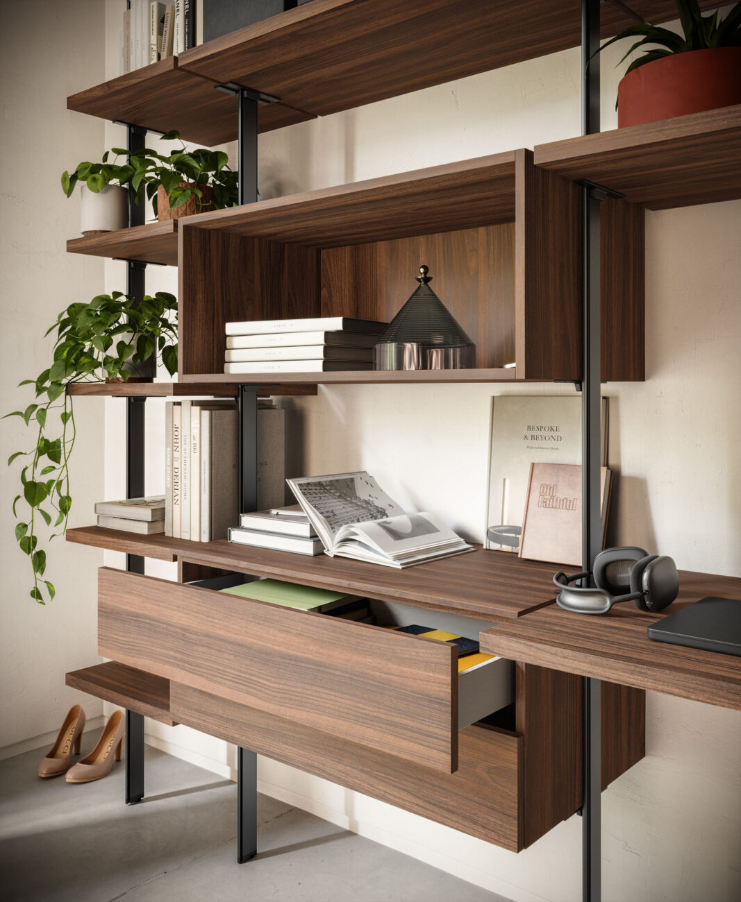 Cabina Pole in Cotto, attrezzata con ripiani, cassettiera e scrivania.