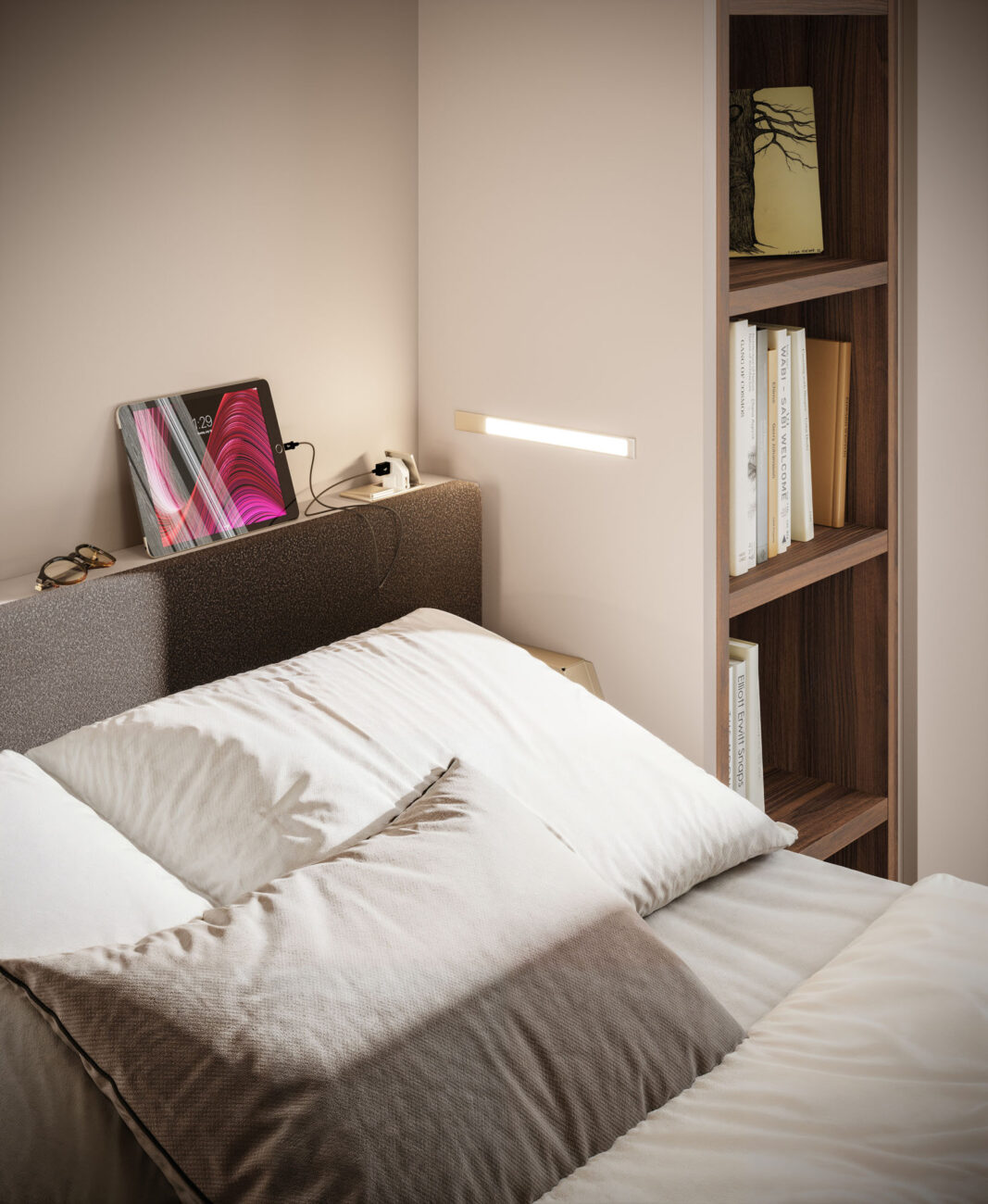Armadio battente Liscia in Tortora con maniglia M 31 in tinta e colonna libreria in Cotto. Letto Sensai in Tortora con luce LED e prese multifunzione.
