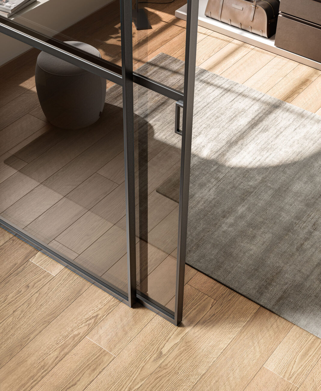 Portale Plus con ante scorrevoli in vetro Fumè, telaio e maniglia bruniti.