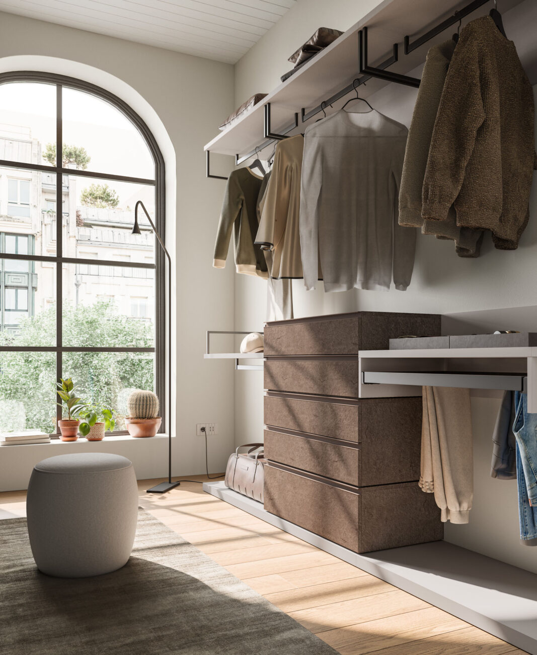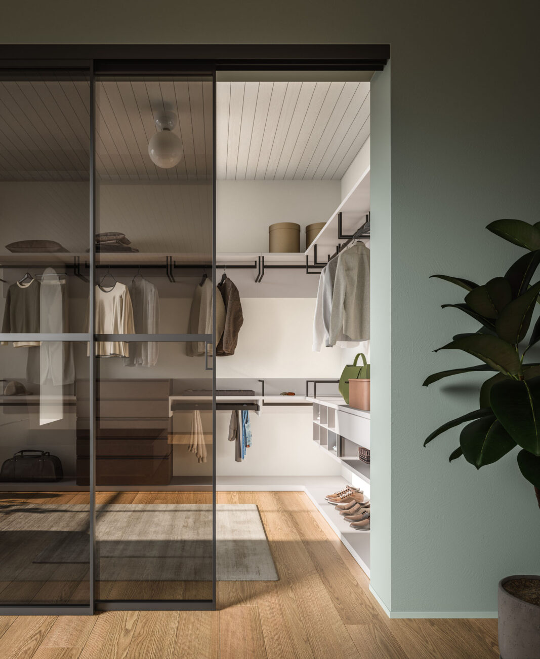 Cabina Alea in Velluto e cassettiere Bravo in Dekor Bronzo. Portale Plus con ante scorrevoli in vetro Fumè.