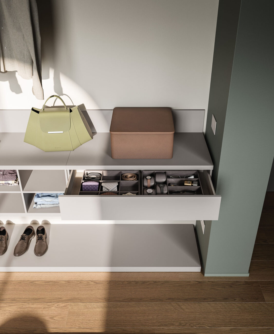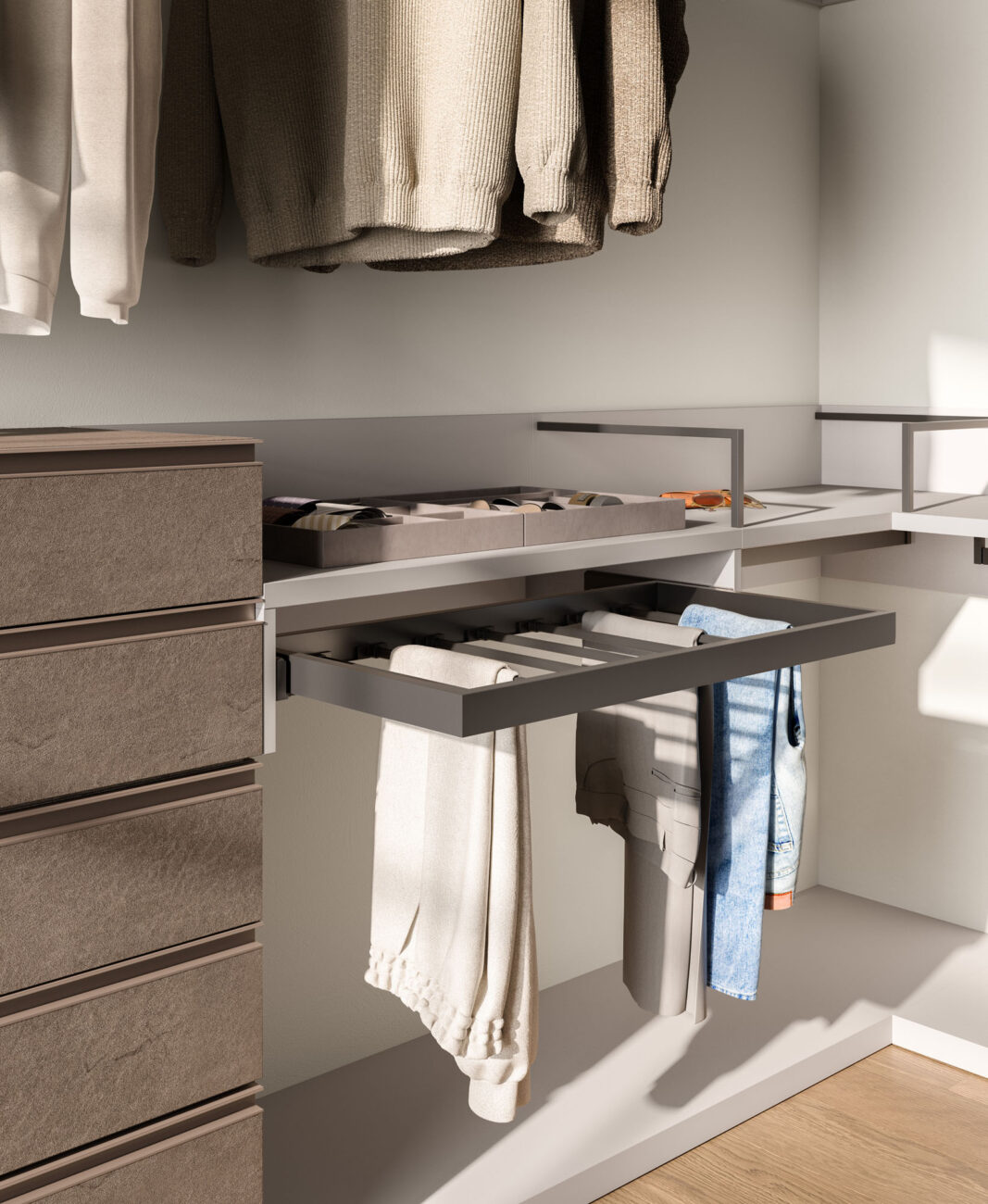 Cabina Alea in Velluto con mensole, portapantaloni estraibile, panca e pensile con cassetto.