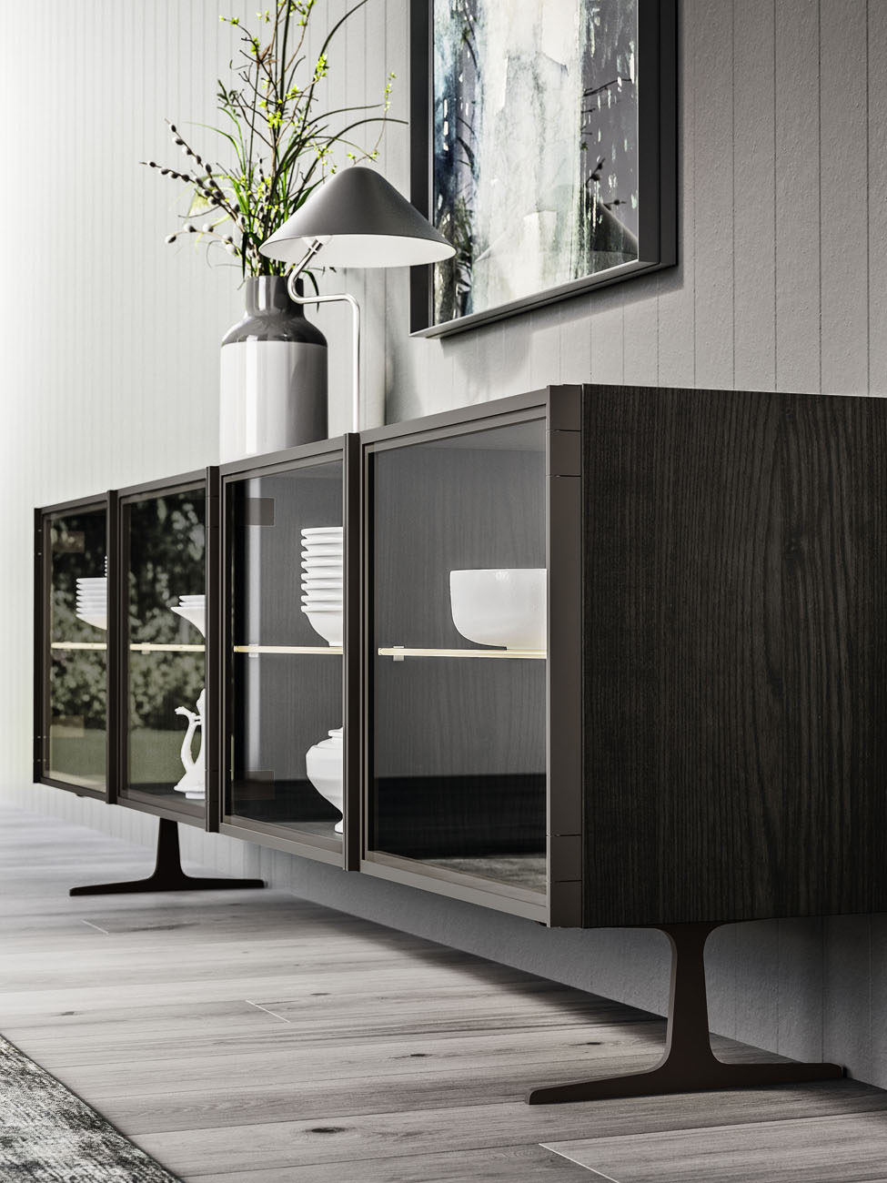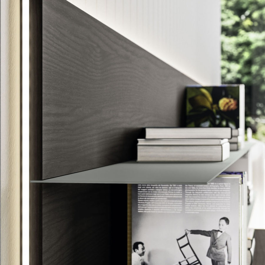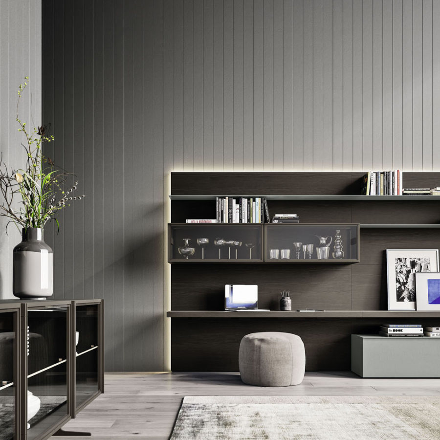 Elementi Unit in laccato opaco Nebbia ed elementi Strema in impiallacciato Ossidato, basi sospese Modulo in laccato opaco Nebbia con anta Linea.