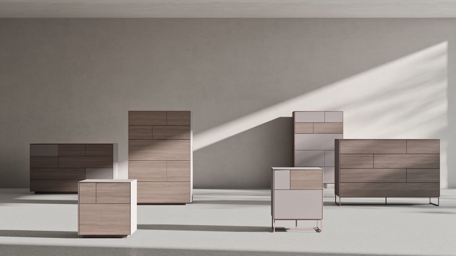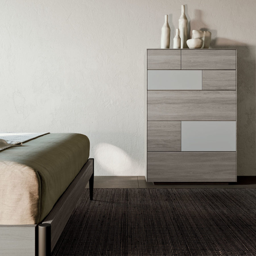 La combinazione dei frontali del gruppo Klee garantisce una vasta possibilità di accostare finiture e colori. Il gruppo è composto da un comodino a due cassetti, un comò a quattro cassetti e un settimanile a cinque cassetti, disponibili con basamento in legno o in metallo laccato.