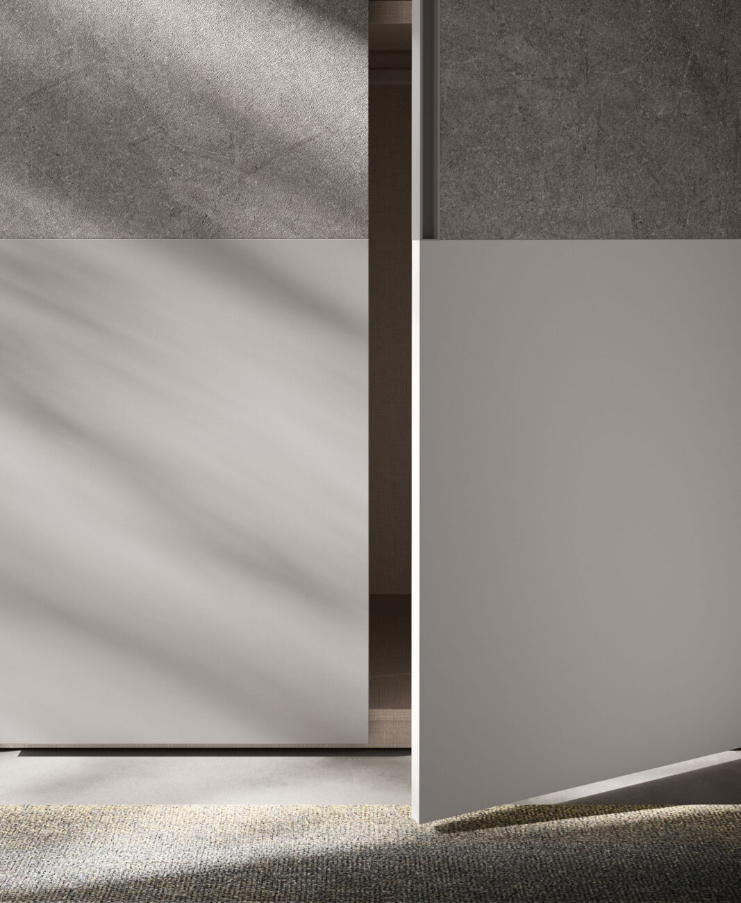 Armadio battente Tratto UP in Velluto e Roccia Bolsena. Struttura interna in Cotone.