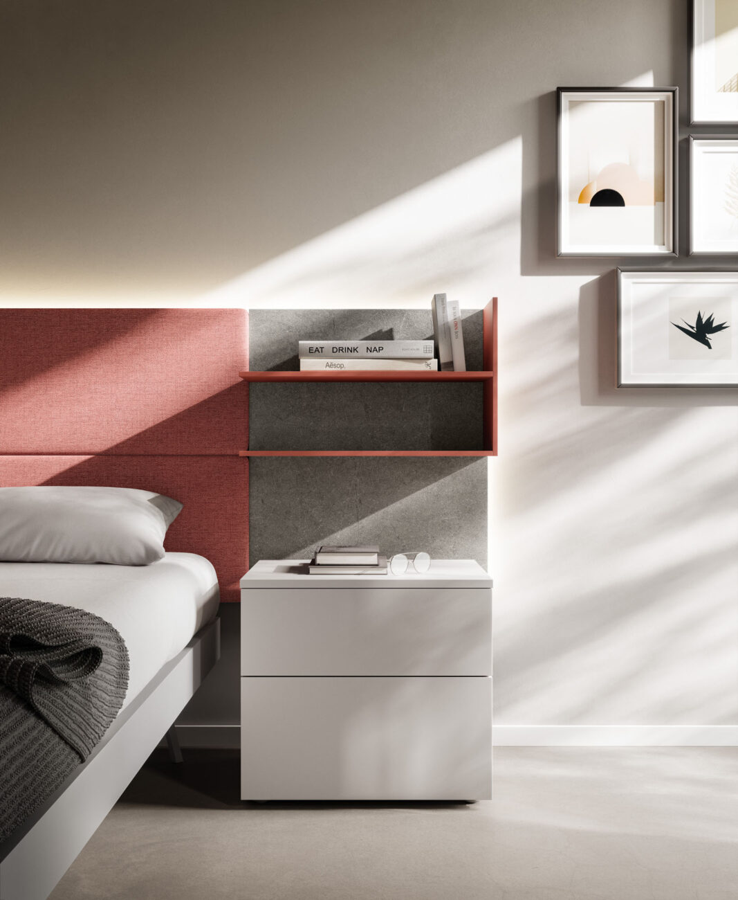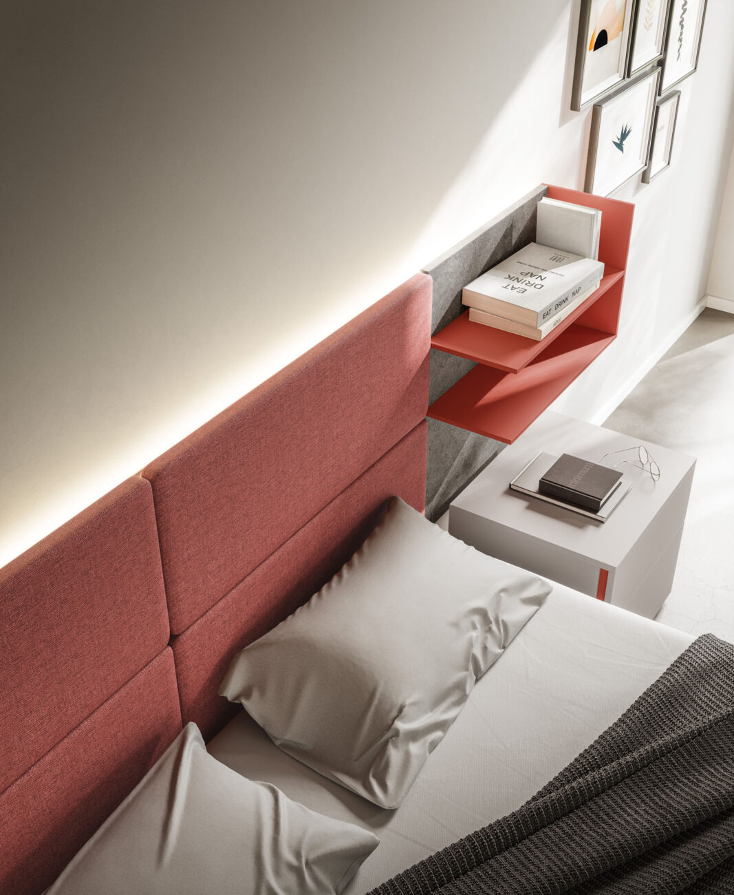 Boiserie Giako Basic in Roccia Bolsena e tessuto Dafne DA25, casellario in Corallo, giroletto Alfa in Velluto. Comodino Flow in Velluto con particolari in Corallo.
